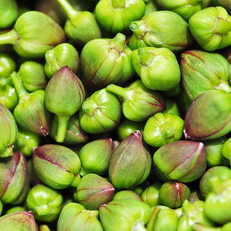 - Flower buds – pickled and used as a flavouring in sauces, salads etc. The flower buds are harvested in the early morning and wilted before pickling them in vinegar. A sharp, piquant flavour, they add pungency, a peculiar aroma and saltiness to foods such as pasta sauces, pizza, fish, meats, and salads. The flavour may be described as being similar to that of mustard and black pepper, coming as it does mainly from mustard oil in the plant tissues.